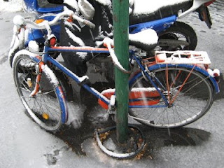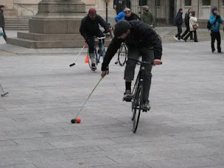 O último dia do Bicycle Film Festival em Milão foi ameno, depois da neve e da chuva. No meio da adversidade, nenhuma das actividades outdoor previstas no programa foi cancelada. No Domingo decorreu a corrida de ciclocross urbano (à qual não assisti) e um jogo de bike polo. Este jogo consiste, já se vê, em jogar polo sem cavalo usando uma bicicleta de roda fixa em substituição. A roda fixa não é obrigatória, segundo as regras de vários grupos que consultei (por exemplo aqui e aqui) mas em Milão não vi nenhum jogador com outro tipo de bicicleta. A modalidade, ou variante, a que assisti chama-se "hard court" e assemelha-se às versões street ou urban de alguns desportos: qualquer ringue desportivo ou corte de ténis serve. No jogo ao qual assisti as regras estabeleciam equipas de 3 jogadores, ganhando aquela que primeiro marcasse 3 golos. A equipa que perdesse dava lugar a outra, no fundo uma "roda bota fora".